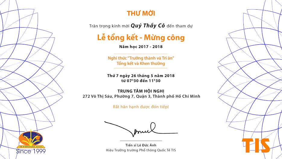 Trường Quốc Tế TIS xin trân trọng kính mời Quý Phụ Huynh, Học sinh và tất cả GVNV cùng đến tham dự buổi lễ Tổng kết- Mừng công năm học 2017-2018 và Lễ Tri ân – Trưởng thành Lớp 12.