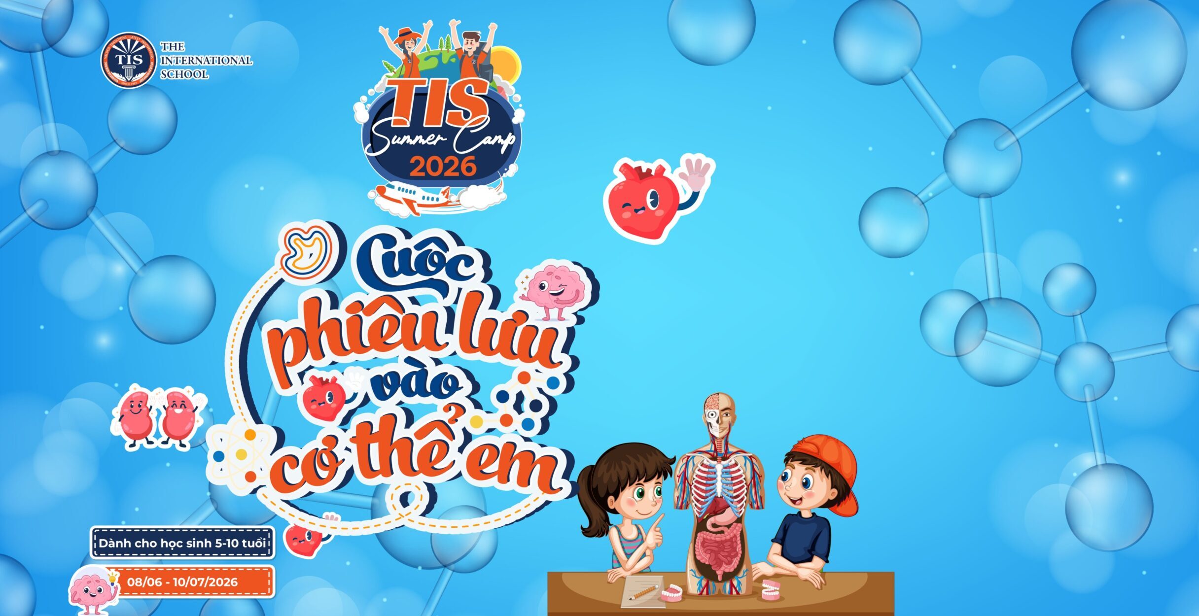 TIS Summer Camp – Cuộc phiêu lưu vào cơ thể em là chương trình học hè bổ ích cho học sinh từ 5-10 tuổi, đảm bảo phát triển về kiến thức, kỹ năng và ngôn ngữ. Bé sẽ được tham gia hàng loạt động hấp dẫn để khám phá kiến thức về “cỗ máy” cơ thể người, học cách chăm sóc bản thân và xây dựng một lối sống lành mạnh.